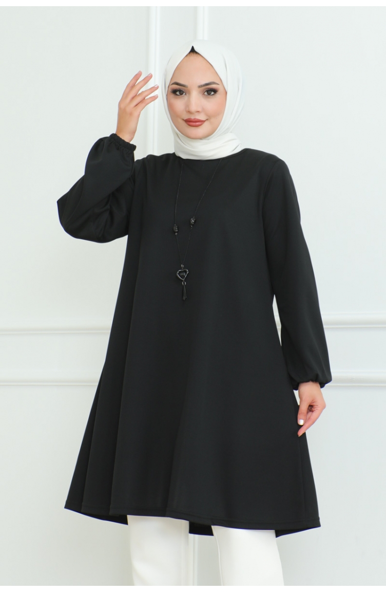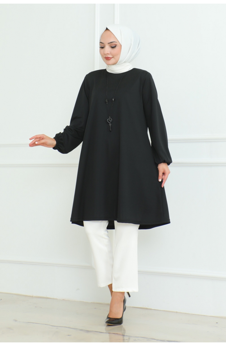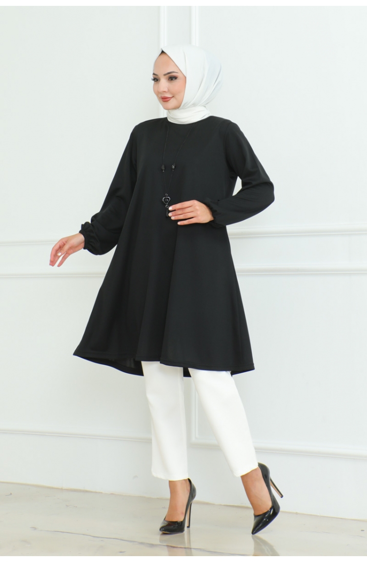 Siyah renktedir. Krep örme kumaş. Sade. 4 Mevsim tercih edebilirsiniz. Büyük beden seçeneği mevcuttur.
